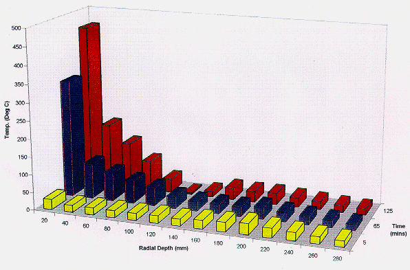 Data generated by Nirex has indicated that, for cementitious wasteforms a pessimistic caesium release fraction at 300°C and 1000°C range from 2 x 10-4 and 2 x 10-1 respectively (5). This release data is then considered against thermal models for waste packages to assess overall releases during fire accidents. Modelling, verified by full scale fire testing of simulant wasteforms by Nirex and major customers such as BNFL during their development programs, has shown that even in an extreme 1000°C fire of 2 hour duration, less than 0.05 of the wasteform could be up to 1000°C with the rest of the wasteform not exceeding 300oC. In such cases the release would be less than 0.1 TBq of Cs-137 (or 0.2A2) which is well within tolerable release targets being considered in the planning and design of the deep waste repository.