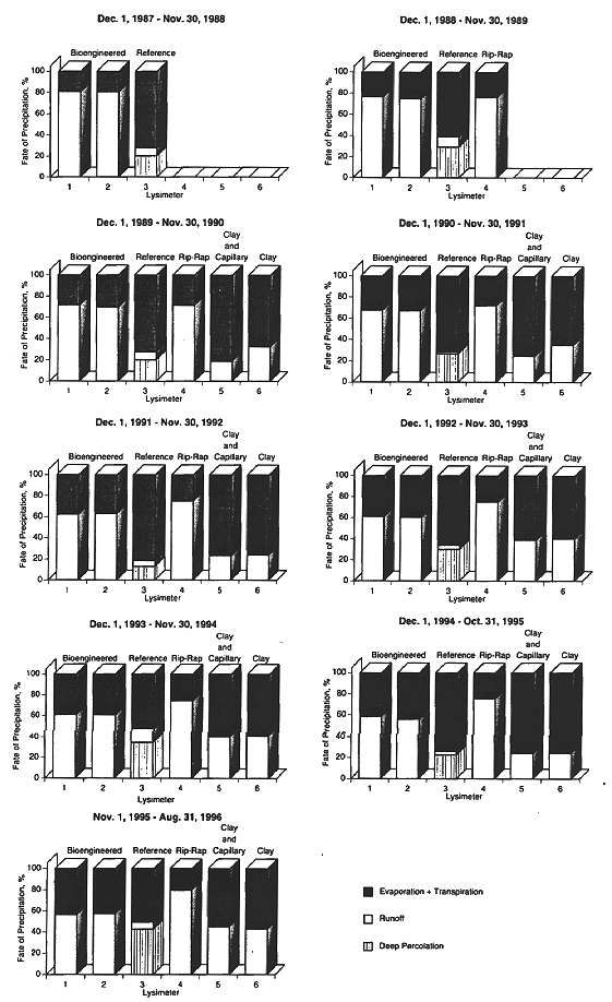 In addition to rainfall, run-off, and evapotranspiration measurements discussed above, neutron-probe soil-moisture measurements were made continuously to monitor soil moisture changes in lysimeters 1, 2, 4, 5 and 6 depicted in Fig. 4, referenced in (5). The neutron probe measurements will indicate whether there is a gain or loss of moisture from the soil profile or, perhaps, steady-state situation, where there is little or no net gain or loss of soil moisture during a year. A steady-state situation with relatively constant-moisture "dry" soil above waste would be highly desirable with a bioengineered cover. There would then be a large safety margin to protect the waste from infiltrating water.