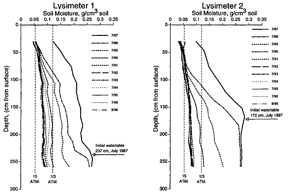 Results of some neutron probe measurements are shown in Fig. 2 for bioengineered lysimeters 1 and 2. The data are plotted as volumetric moisture content, as a function of soil depth, on specific dates. Eleven widely spaced measurement dates are shown, for clarity. From inspection of the figure it is seen that, at the start of the experiment in July, 1987, the moisture content of the soil increased with depth until the water table was reached, then became constant. By July, 1989, the water table had been eliminated from both lysimeters, and the soil profiles were drying out. However, the soil moisture content, although much lower in the soil profile than in July, 1987, still increased with depth. This same relationship was still evident in August, 1996, although the soil profile had become still drier.