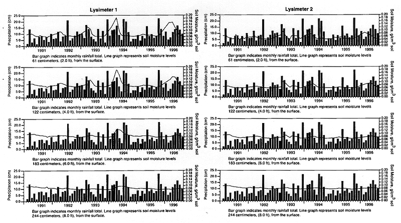 Figure 12, referenced in (5), shows the moisture content of the soil profiles in lysimeters 1 and 2 at the end of each seasonal year. Following the complete removal of the water tables during the 1987-1989 period, the soil profiles were dried out further during the ensuing years. However, an unanticipated result turned up in lysimeter 1 at the end of seasonal 1993-1994. The moisture content of the soil profile increased slightly. To shed light on that result, the moisture content in the soil profiles at four depths were plotted monthly along with monthly rainfall data (Fig. 3). Here we see seasonal cyclical variations in moisture content in the soil profiles, with peak moisture concentrations occurring in the early spring, following periods of significant rainfall and minimal evapotranspiration. That cycling is both obvious and expected. What was totally unanticipated was the increase in the moisture peaks in lysimter 1 in each of the 3 seasonal years leading to 1994-1995. The increasing amplitudes of the moisture curves did not appear to be a result of rainfall variations, nor were they present in lysimeter 2. The aforementioned trend did not continue during the past two years, seasonal 1994-1995 and seasonal 1995-1996.