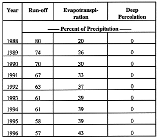 Figure 1 shows that there was very little run-off from the grass-covered plot. Most of the precipitation was disposed of, via evapotranspiration, by the fescue crop, but this was not adequate to prevent the rise of the water table. Table I gives the run-off, evapotranspiration, and deep percolation in the bioengineered plots during the past nine years. There was no deep percolation during this period. Until seasonal 1993-1994 the evapotranspiration had been rising annually, probably as a result of the greater vegetative canopy intercepting a greater percentage of the precipitation. In 1988, 1989, 1990, 1991, 1992, 1993, 1994 and 1995 the run-off percentages were 80, 74, 70, 67, 63, 61, 61, and 58, respectively (5). In 1996, the run-off decreased to 57% of the precipitation. During 1989, the water table was completely eliminated in both plots in Fig. 8, referenced in (5).