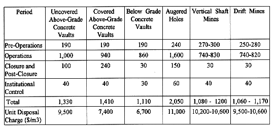 Note: The Unit Disposal Charge (UDC) is higher for the mines due primarily to the cost of constructing the mine accesses. This UDC calculation is significantly affected by the volume of waste available for disposal due to these fixed up-front costs. A higher annual receipt rate, or front loaded receipts from storage would therefore favor mines and result in a lower than projected UDC.