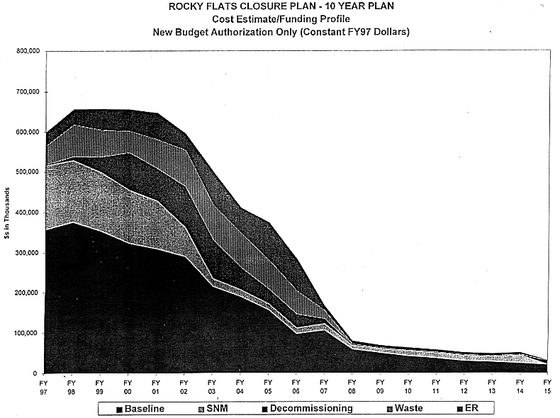 Rocky Flats can achieve almost complete cleanup and closure by the end of fiscal year 2006 for a cost of approximately $5.4 billion. The total cost to manage the remaining plutonium from FY07 until it is removed by the end of FY15 and to perform environmental monitoring is estimated to cost and additional $600 million. Following removal of the plutonium and the demolition of the plutonium storage and remaining Site facilities by the end of 2015, the cost to perform the long-term environmental monitoring an the site is estimated to be $10 million per year.