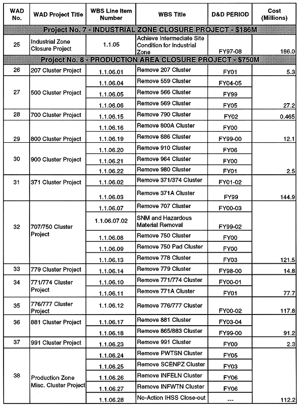 The Plan was developed around twelve major projects. The twelve major projects are delineated by the Site Work Breakdown Structure (WBS) which presents the Site as a single integrated project aimed at mission termination and Site closure. It is organized into fifty-seven groups or Work Authorization Documents (WADs) which are used to control work at the Site. Only two projects and 14 WADs are associated with decommissioning activities. These are listed in Table 1 along with titles and WBS line item numbers identified in the Plan.