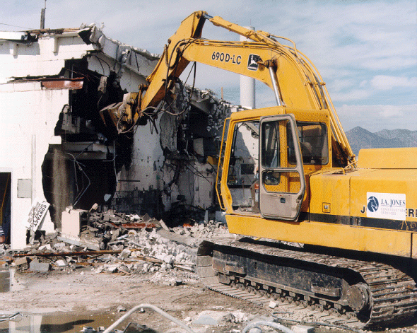 A building demolition plan was developed in accordance with OSHA 1926.850, Subpart T, Demolition. An engineering survey of the building was performed by a licensed professional structural engineer to determine the sequence of demolition and to ensure the protection of workers and surrounding property. The plan also addressed the control of fugitive dust. The demolition was contracted to a outside vendor. Building demolition was performed using a backhoe outfitted with a hydraulic shear, as shown in Fig. 2, below.