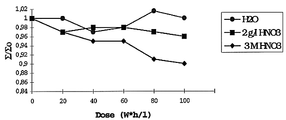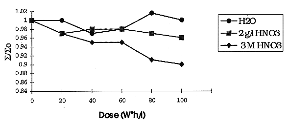 A comparison of IT as a function of irradiation is given in Fig. 3. There is practically the same IT value for all types of aqueous solutions and relatively low effect of the total dose, except of the more concentrated nitric acid solution. A lack of simple correlation between RD and IT may be caused by different chemical and hydrodynamic factors discussed earlier (2).