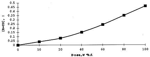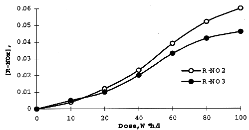 The concentration of DB-7 in organic solution on irradiation was measured spectrophotometrically using technique described in (6). Analysis of Infrared Spectra of irradiated extractant in the range since 1500 thru 2000 cm-1, has shown a formation of carbonyl derivatives (1730 cm-1), organic nitrates (1640 cm-1) and nitrites (1680 cm-1) produced in result of oxidizing and nitration of the diluent - higher alcohol. Radiation yields for these adducts - measured using appropriate kinetic diagrams (Fig. 4). are: 10.5 (R=CO), 1.3 (R-ONO2), and 1.5 (R=NO2) molecules per 100 eV.