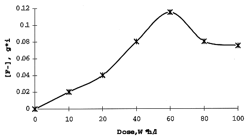 Special attention was paid to an accumulation of fluoride-ions in the aqueous phase as a result of radiation decay of the solvent (FA) given in Fig. 6. The concentration of F- increases up to a total dose 60 W*h/l and then slightly decreases. A possible reason for the maximum is the interaction of fluoride-ions with nitric acid and a formation of volatile or extractable compounds. Initial radiation yield of F- is 5.5 ions per 100 eV, while the highest concentration of fluoride is 0.12 g*ion per liter - below the permissible corrosion-proof level of the standard extractor.