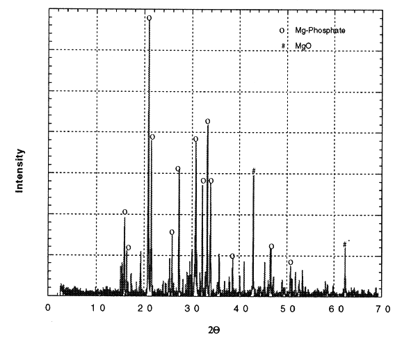Figure 1 shows an X-ray diffraction (XRD) pattern of the CBPC-36 wt.% eluted waste form. The major phase is of magnesium phosphate system, a highly insoluble phase. In addition, there is some unreacted magnesium oxide. Using XRD on the final waste forms, we determined that both crystalline and noncrystalline phases of magnesium phosphate are present as the binding phases. Analysis of noncrystalline phases, which is much more complex and requires a combination of techniques, is currently the focus of our work.