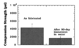 Specimen strength after exposure to deionized water were 1700 ± 372 psi.