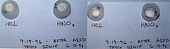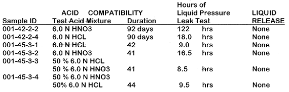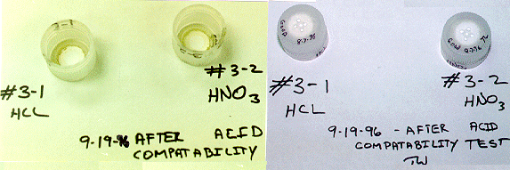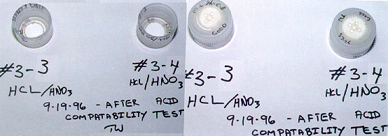 During the first phase of acid compatibility testing, from February 15, 1996 to May 21, 1996, it was found that the cap that had been exposed to HCL failed the pressure test. After close examination of the cap and the seal, it was decided that the cap actually had a poor seal in it prior to testing. Indeed, the caps were not tested as carefully during the first phase of development as they were in later stages. The cap exposed to the 50/50 mixture of 6 normal HCL and HNO3, and the cap exposed to HNO3, passed the leak test.