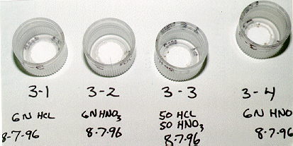 The caps that had been exposed to 6 normal HCL or HNO3 showed no signs of degradation and only slight discoloration consistent with normal aging and dirt accumulation from being in a laboratory. Figure 3 shows caps #3-1 and #3-2, after more than 40 days of exposure to HCL and HNO3.