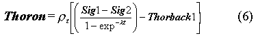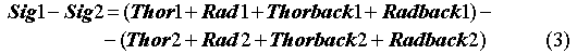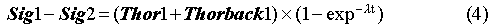 Here, Sig1 and Sig 2 are the results of subtracting external backgrounds from the raw signals, and applying a normalization factor to account for any asymmetry between the overall collection efficiencies of the two detectors. The thoron and thoron daughter contributions are related by