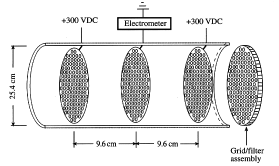 Figure 1 shows a detail of one of the detectors. Filter assemblies on either side of the detector volume are intended to provide a uniform airflow through the detector. The actual velocity profile of the airflow within the volume is of lesser importance than insuring that the airflow is identical in the two detectors. Three grids between the filters are used to collect ionized particles. Each grid is a circular stainless steel plate, 0.15 cm thick, and perforated with 0.32 cm-diameter holes to give 40% open area in the plates. The grids extend to nearly the inner diameter of the pipe, where they are suspended from the inner walls with Lexan standoffs. The two outer grids, each 10.2 cm from the center grid, are placed at +300 VDC, while the inner grid is connected to ground through a Keithley 6517 electrometer.