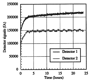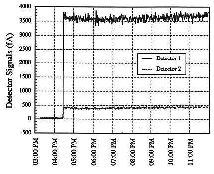 Figure 2a shows a run in which there are initially only background levels of radon present. A regulated compressed air supply created the airflow through the monitor. The thoron source was then placed in a pipe just upstream of a HEAP filter so that the monitor would see only background ionization and that due to thoron and its progeny. The figure shows the immediate rise in signal of the first detector, followed closely by a lesser rise in the signal of detector 2. The slow initial decrease in both signals is attributed to a decrease in the thoron output of the source. The decrease is reflected in the calculated thoron and radon levels shown in Figure 2b. The statistical error in the calculations, using the 2.5-minute effective time averaging in the code, is <5% for concentrations as low as 200 pCi/l. The small spikes seen at the point of insertion of the thoron source is due to the invasive nature of the method of insertion, which required temporary disruption of the airflow.