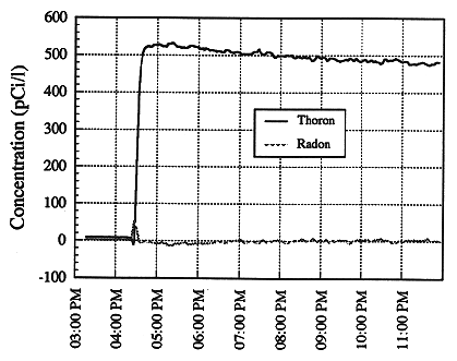 Testing of the monitor was limited by the availability of radon and thoron sources. Most results were obtained using thorium ore specimens which supplied approximately 500 pCi/sec of thoron. At the airflows used (generally near 1 liter/sec) the concentration was about 500 pCi/l. In long test runs in several prototype monitors, both airflow and electrostatic, the source showed diurnal fluctuations in thoron output which were attributed to temperature fluctuations.