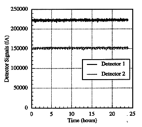 - Electrometer reads current first in detector 1 and then in detector 2.