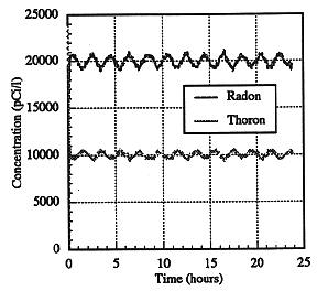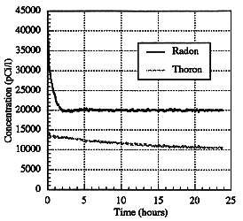 initial radon concentration of 20,000 pCi/l and 10,000 pCi/l of thoron at 1