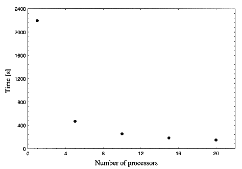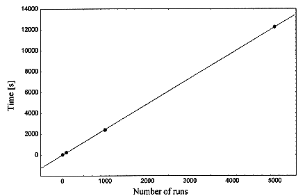 Figure 2 shows that for ten processors, the elapsed time increases linearly with the number of realizations. For 5000 realizations it took 12,254 seconds with ten processors, i.e., the cost of communication between processors has decreased and the time elapsed is lower than expected(12,650 seconds). Thus the performance shown by Figure 2 has increased in going from 100 to 5000 realizations. This performance is in fact somewhat better than the one given by the linear extrapolation, which is considered "the ideal" case. We say therefore that the code is working in the super-linear regime.
