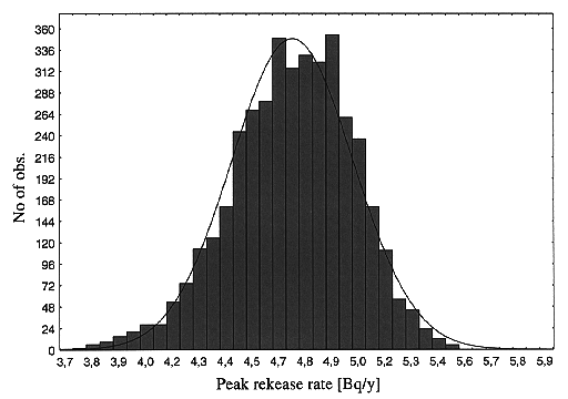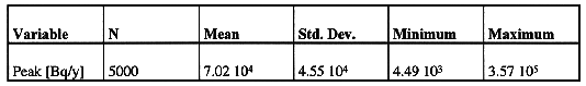 The Monte Carlo driver delivers 5000 breakthrough curves as the output of the simulation. The mean peak value is used as the risk measure (or consequence measure) in the analysis. The distribution of peak releases is shown in Fig. 3