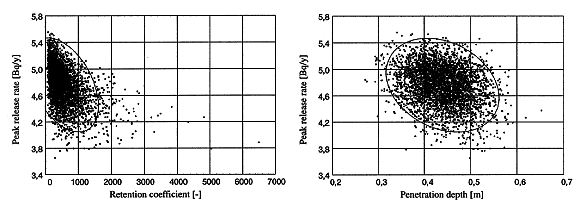 Figure 4 presents the scatter plots of peak release versus two variable parameters which illustrate the subjacent correlations between parameters and the output consequences. The ellipses represent the 95% confidence level boundaries. As expected from the results of Table III, the scatter plot of the retardation coefficient of Figure 4a illustrates a stronger correlation with the peak release rate than the scatter plot of the penetration depth which is the third parameter in importance.