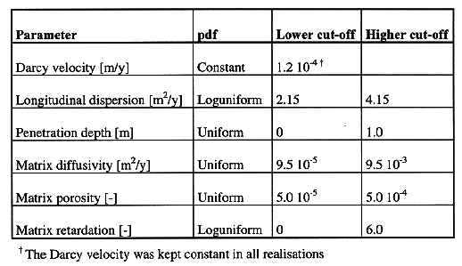 To define a case study we make a certain number of assumptions that, for the sake of simplicity, we call a scenario. In our scenario we assume the existence of a single canister which for some reason fails, initiating a leaching process. Because we are interested in the impact of the heterogeneity in the far-field, we use the same source term for all realizations in the Monte Carlo simulation. The times series describing this source term is the same as that used in Andersson et. al. (1). The nuclide used in this study is 243Am, which has a half-life of 7.38 x 103 years. The far-field parameters used in CRYSTAL3D are summarized in Table I, together with the pdfs from which they are sampled and their respective ranges.