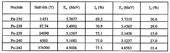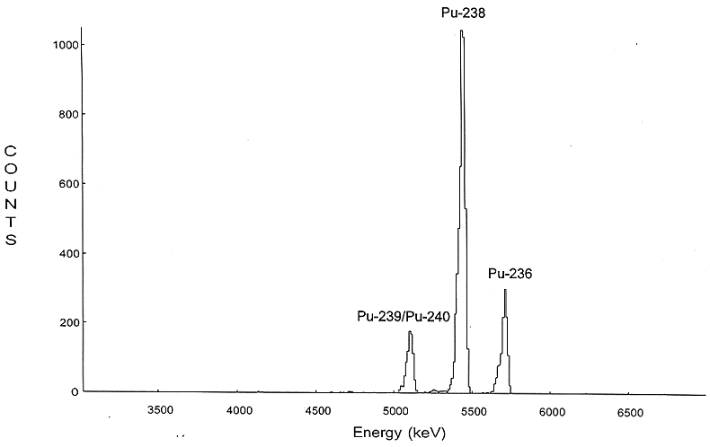 Plutonium measurements were made on an eight-channel Canberra Alpha Analyst spectroscopy system equipped with Canberra model A-450-20-AM alpha PIPS detectors. The Analyst is interfaced to a personal computer (model P5-100 Pentium) for system control, data storage and processing using Genie PC-based alpha analysis software. The system was calibrated for efficiency response as a function of -particle energy using an Amersham electroplated standard alpha source 9734RA containing 241Am,239Pu and 244Cm.