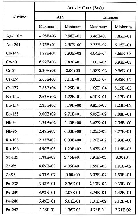 bitumenizer. The range in activity concentrations of the various radionuclides