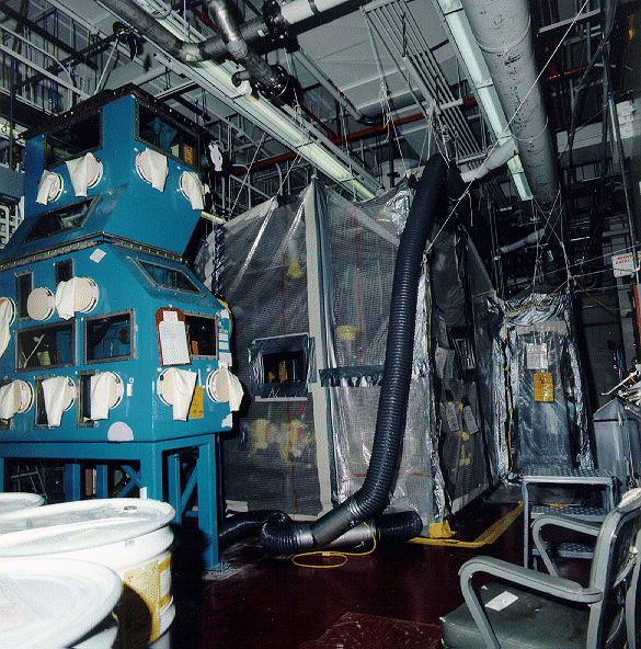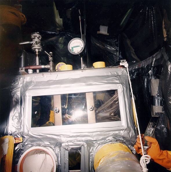 After the external equipment and services were removed and the area around the glovebox was cleared, a soft-sided containment (SSC) was constructed. An example of this is shown in Fig. 2. This containment was required to reduce the risk of spread of radiological contamination and to comply with the Lead Compliance Plan. In addition, since a small percentage of asbestos was identified in the lead shielding adhesive, the SSC was used for asbestos abatement. A hard-walled containment is normally more desirable than an SSC. In this case however, the space restrictions in the module and routine access required by personnel performing thermal stabilization, prevented their use.