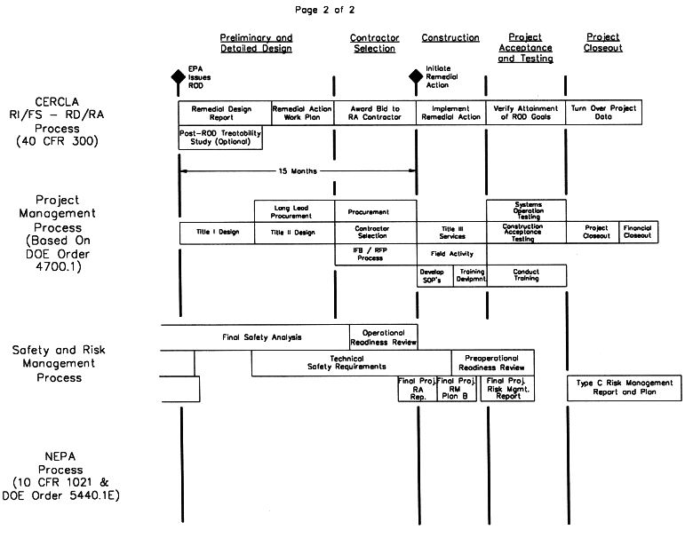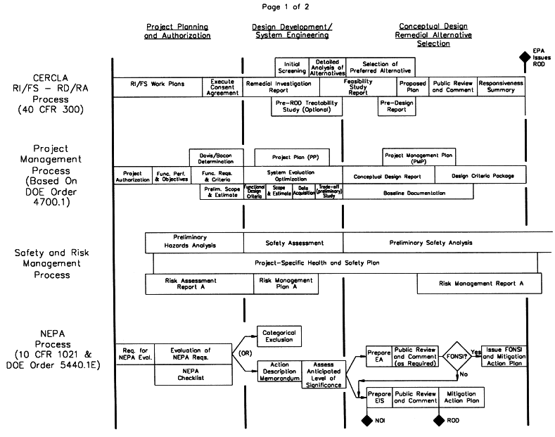 In looking at the "idealized" time-line/flow chart in Fig. 1, Overview of Project Management (2), which includes establishing functional design criteria and developing scope and estimates, RD/RA input should occur as a parallel activity with the compilation of the RI report and the Conceptual Design should begin before the FS report is complete. The objective is to have the Design Criteria Package complete by the time EPA/State/Local Authorities issue the ROD.