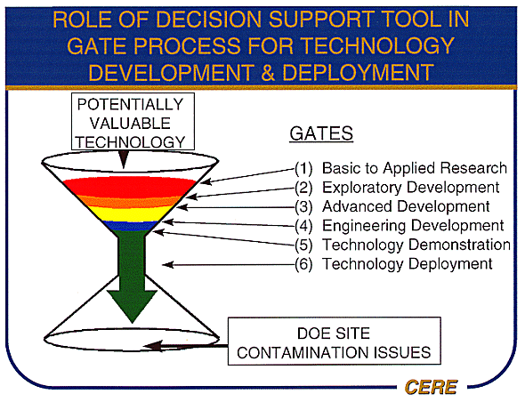 CERE is designing an integrated framework for planning, making, and communicating decisions for selecting technologies to remediate contamination. At the present time, as Fig. 1 illustrates, the DOE decision process for developing and deploying environmental management technologies is structured according to a sequential "gate" process with each gate representing a major decision point vis a vis proceeding with a given technology to the next stage in its maturation (National Research Council 1995). DOE's "gated" decision-making process divides the innovative technology development cycle into six stages. The first four "gates" involve technology development decisions, while the later two involve deployment decisions: