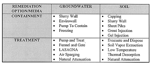 The CERE technology evaluation framework is being applied initially to trichloroethylene (TCE) contamination of soil and groundwater to demonstrate its utility as a decision support tool. A four-celled approach to containment and treatment by media of the contaminant is used, with illustrative technologies selected for each cell (see Table II). The technologies include a mix of innovation and existing, conventional technologies appropriate for the remediation options being considered.