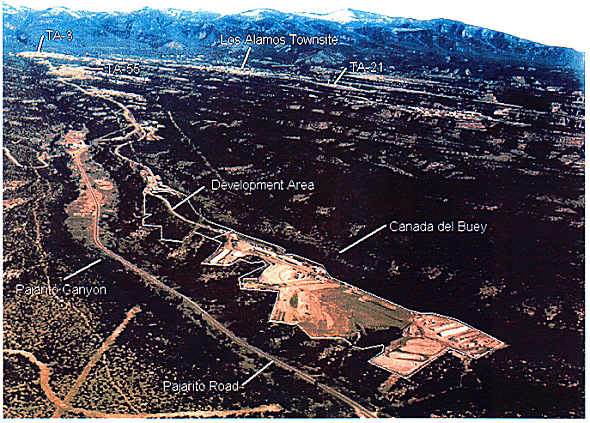 The surface of Mesita del Buey is about 275 m (900 ft) above the regional aquifer, which supplies the drinking water for area residents. The mesa is about 30 m (99 ft) above two canyons, Canada del Buey to the north and Pajarito Canyon to the south. The host bedrock is known as Bandelier Tuff, which was deposited about 1.5 million years ago by volcanic eruptions in the Jemez Mountains to the west. The Bandelier Tuff comprises roughly 30 percent of the 275 m (900 ft) thick vadose zone.