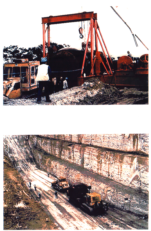 While this example is unusual, it is not unique; there are two experimental reactors buried at Area G. In general, waste is placed in the pit in layers or lifts. Waste is covered with clean crushed tuff, and the tuff is consolidated using heavy equipment, as shown in the photograph in Fig. 3.