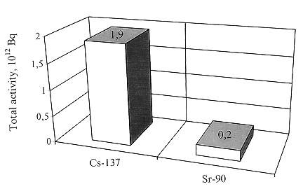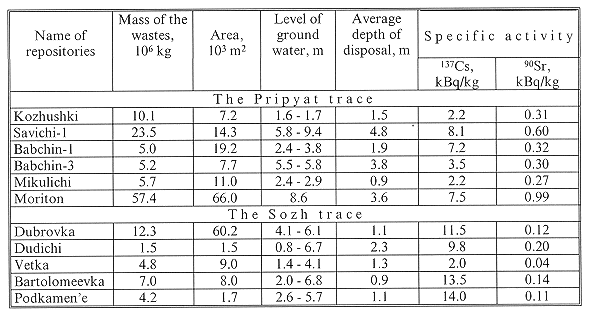 In 1986-1987, 69 repositories have been altogether arranged for 3 ·.105 m3 of wastes (1). In 1992-1993 the repositories have been examined and registered. The vital fraction of long-lived radionuclides in the nearest zone (the Pripyat trace) has been deposited as fuel particles with the density of contamination 230-1470 kBq/m2 and 15-30 kBq/m2 for 137Cs and 90Sr, respectively. The average specific activity of the products of decontamination in the disposal sites of this zone accounts for 3.4-7.5 kBq/kg for 137Cs and 290-900 Bq/kg for 90Sr. The depositions of the distant zone (the Sozh trace), which are the highly enriched volatile compounds of radionuclides, are characterized by density of contamination for 137Cs 500-2700 kBq/m2 and for 90Sr 5-25 kBq/m2. Average specific activity of radioactive products of decontamination is 1.6-14 kBq/kg and 40-200Bq/kg for 137Cs and 90Sr, respectively. Total activity of the products of decontamination are given on Fig.1.