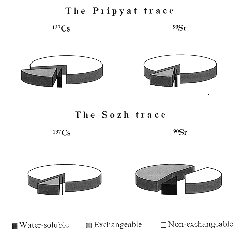 The analysis of the forms of existence of radionuclides in the products of decontamination has shown, that in the nearest zone there is 137Cs in water-soluble (0.4-1.6%), exchangeable (3.7-18.2%) and non-exchangeable (80.8-95.9%) forms. For the products of decontamination of the distant zone (the Sozh trace) the fraction of water-soluble, exchangeable and non-exchangeable forms of 137Cs is lower - 0.1-0.17%, 5.5-15.1% and 84.7-94.4%, respectively. The analysis of distribution of 90Sr in radioactive wastes of the nearest and distant zones according to the forms of existence has shown, that they differ essentially. Thus in the nearest zone 90Sr is in the water-soluble (0.6-3.3%), exchangeable (8.2-31.6%) and non-exchangeable (65.1-91.2%) forms, and in the distant zone (the Sozh trace) these values are 5.0-7.7%, 45.4-61.0% and 31.8-46.9%, respectively. The ratio between the forms of existence of radionuclides in the products of decontamination are given on Fig. 2.