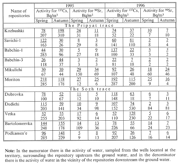 The results, have shown, that the specific activity of the ground water in spring is as a rule higher, than in the autumn period of control. For the most repositories the excess of the content of 137Cs and 90Sr in water samples from the wells located downstream of the ground water has been registered. It is the reason for argument, that there is the migration of radionuclides from the wastes of decontamination. As a result of carried out studies it has been found out, that in 1994-1996 there has been no marked change in the content of radionuclides in the ground water in the locations of repositories. Maximum values of activities of the ground water for 137Cs and 90Sr are within the level 530 and 150 Bq/m3, respectively. It is substantially higher, than the activity of the ground water in the basins of the Pripyat and Sozh rivers before the accident at the Chernobyl NPP, when the activity of caesium and strontium radionuclides in the ground waters has been less, than 1 Bq/m3. For all controlled repositories the content of radionuclides in the ground water don't exceed the permissible levels accepted in the Republic of Belarus for drinking water equal to 18500 Bq/m3 and 370 Bq/m3 for 137Cs and 90Sr, respectively.