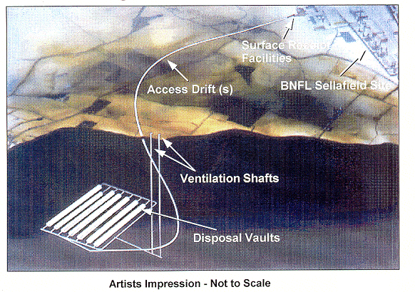 The Nirex mission is to provide a safe, environmentally sound and efficient service to dispose of the United Kingdom's intermediate-level radioactive waste (ILW) and some low-level waste (LLW). That service includes guiding waste producers on requirements for waste conditioning and packaging, developing an integrated transport system and constructing and operating a disposal facility. Nirex is concentrating its investigations on Sellafield, in Cumbria, England as a potential location for a deep repository. The Nirex disposal concept is illustrated in Fig 1.