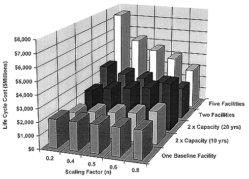 Life cycle costs (in present year dollars) were estimated assuming a government- owned, contractor-operated (GOCO) facility, and were based on preconceptual designs, detailed equipment lists and equipment layouts, and facility isometric drawings. While these analyses were being performed on the basis of a fixed set of assumptions, questions arose regarding the sensitivity of the costs to these assumptions. Another study (9) evaluated the sensitivity of system life cycle costs with respect to cost element and subsystem, facility capacity and availability, operating life, contingency allowance, and disposal costs.