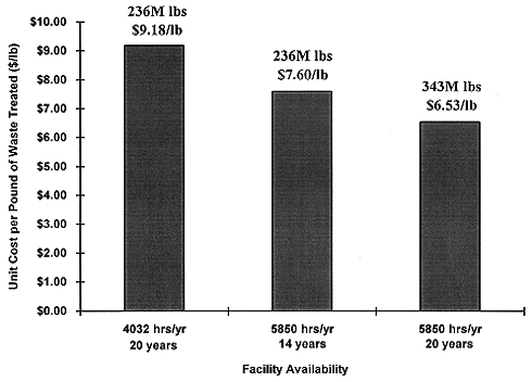 Alternatively, at the original throughput rate of 2927 lbs/hr, 343 million pounds (156 million kg) of waste could be treated over 20 years operating at 5,850 hours/year. The total treatment cost increases to $2,239 million, but the cost per pound to treat this increased quantity of waste is $6.53/lb ($14.40/kg) or $2.65/lb ($5.84/kg) less than the baseline unit cost. The decrease in unit cost for an increase in availability is shown in Figure 2.