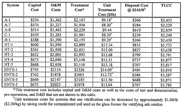Total life cycle costs (TLCC) were estimated for all major cost components such as technology development and demonstration, pre-construction project costs including design and permitting, construction and equipment, operations and maintenance, decontamination and decommissioning (D&D), and disposal. Disposal is assumed to be in an engineered RCRA facility with a disposal cost of $243 per cubic foot ($8580/M3) . The waste was assumed to be disposed on site and no costs associated with transportation to or from the facility were included. Subsequent studies have shown the transportation costs would be small compared to the TLCC and could be ignored without impacting the conclusions. In the following discussion TLCC refers to total life cycle cost including disposal, whereas the term "treatment cost" refers to total life cycle cost without disposal.
