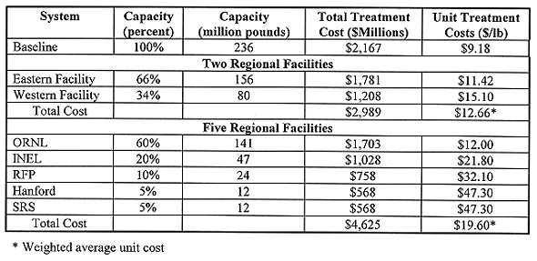 The second case considers five regional treatment facilities located at the larger DOE sites where over 176,600 ft3 (5,000 m3) of MLLW are stored (i.e., Hanford, Idaho National Engineering Laboratory, Rocky Flats Plant, Savannah River Site, and Oak Ridge National Laboratory). For this regional option the waste stream inventory for treatment at each of the facilities will not be representative of the entire inventory; therefore, the design, demonstration and testing phase will be required at all sites. Again, the 236 million pounds of input waste was apportioned among the five facilities as shown in Table II. The total treatment cost as a function of scaling factor is shown in Fig. 1. Depending on the scaling factor, operating five treatment facilities results in a 46% to 244% increase in total treatment cost when compared to the baseline. This increase translates to a range of unit treatment costs from $13.45/lb ($29.65/kg) to $31.57/lb ($69.60/kg) compared to $9.18/lb ($20.24/kg) for the baseline system. Total treatment costs for each facility, assuming a scaling factor of 0.5, are shown in Table II.