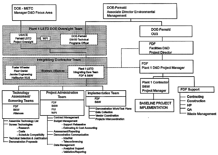 integrate activities into the Plant 1 D&D Project with no critical path interference and with the support of the ongoing D&D project. The key to success for this organizational structure has been the integration of representatives from the Plant 1 D&D Project into the LSTD Project. Thus, the two parallel project organizations were joined not only at the top but also at the heart of each organization's structure. This second point of integration between the two projects was at the "IC Team," which included the FDF Plant 1 Project Manager and the Plant 1 D&D Contractor, and provided the direction for the LSTD as well as approval of all the technology demonstrations. This integration of the two projects within the IC Team ensured that decisions made were focused on the D&D needs of the Plant 1 Project.