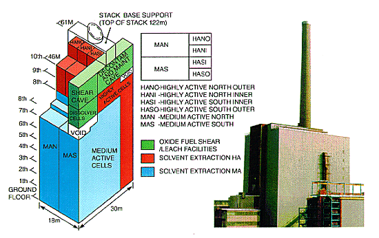 The 61m high building, having a volume of 93,300 cubic meters and a total floor area of 16,000 square meters, dominates the center of the original Sellafield Separation Area, consists of a reinforced concrete process core surmounted by a 61m ventilation stack, see Fig. 1. The process core is divided into two process lines each comprising three cells; two highly active cells for fission product removal and a medium active cell for Plutonium and Uranium separation. Medium active cell shield walls are typically 60 cm thick while highly active cell walls are 1 rn thick. The process core is surrounded by a steel frame building of 11 floors, housing ventilation and effluent plants, inactive services, control stations, and process sampling facilities. As part of the modifications to the South process line for oxide reprocessing a shear cave suite with dedicated ventilation plant was added on the ninth floor and a silo for stainless steel hulls arising from the oxide fuel dissolution process was constructed within the base of the South Medium Active cell.