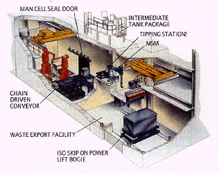 The cell structures are extremely large with no consideration being given to decommissioning requirements at the time of design. No cell access facilities are provide for the addition or removal of pant and equipment, man access is only provided at every 5 meter level via narrow central walkways. No in-cell lifting equipment or lifting support facilities are provided. The large scale un-segregated cell design has resulted in large volumes of low level waste being mixed with plutonium contaminated waste with the resulting complications to criticality control, waste segregation and subsequent monitoring for disposal.