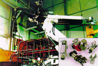 The same telescopic arm is used as in the in-ceil crane but a specially modified proprietary hydraulic manipulator mounted on a self leveling tilt table is fitted to the end of the arm. The 6 DOF hydraulic manipulator has a 2 m reach with an optimum carrying capacity of 125 Kg. To reduce downtime and dose to personnel the manipulator was specially modified, in conjunction with the manufacturers, to provide a remote tool change capability with hydraulic, a.c. and d.c. electrical supplies, camera feeds and tool recognition services running through the manipulator body to prevent snagging and supply failures during operation. A remote tool change tool rack is provided to allow different tools to be selected and utilizes a built in tool recognition system to prevent incorrect services being fed to the tools and causing damage to the units.
