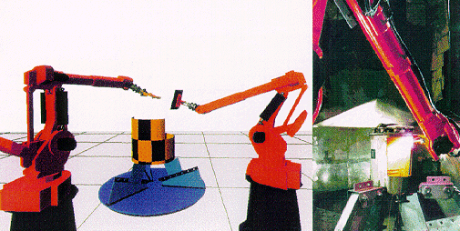 An automatic programming method was required to allow large numbers of points to be programmed efficiently and without entry to the curing station. This was achieved using off-line programming via 3D computer simulation. The IGRIP (Interactive Graphical Robotic Instruction Program) simulation developed in the American automobile industry to eliminate teach and repeat has been adapted to the requirements of the curing station, see Fig. 4. IGRIP allows programs to be produced in the simulated world using models of the vessels then checked in the real world, corrected and run. The simulated models enable singularity conditions and clashes to be identified and resolved prior to size reduction commencing. The configuration of the system computer hardware was chosen to allow the maximum use of proprietary software packages, thus vastly reducing development times and costs.