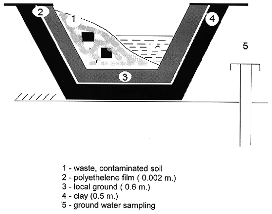 Since 1992 clean-up works in the abandoned areas have been carried out by two specialized state enterprises 'Polesye' (Gomel region) and 'Radon' (Mogilev region), which had been set up under the auspices of the Ministry of Emergencies. About 30000 tons of 'decontamination' waste are formed annually as a result of clean-up activities conducted by these enterprises. The wastes are disposed in 7 repositories constructed from type designs in the abandoned areas ('relocation zones'). All the repositories represent territories with one or two reservoirs banked up with embankments 4 m high. The compacted earth bottom and slopes are covered with pugged clay barriers of 0.5 m thick, which are then covered with stabilized polyethylene film. The film is buried with a protective earth layer 0.6 m thick (Fig. 2). The repository is equipped with a net of boreholes along its perimeter.
