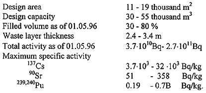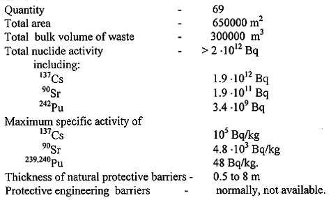 The main goal of clean-up work is to improve radiological situation in polluted populated areas and prevent propagation of radionuclides as a result of fires and unauthorized exportation of contaminated materials. That work includes removal of contaminated soil, decontamination of installations and industrial equipment, dismantling of structures and buildings being not subjected to clean-up. In the period of 1986-1989, about 500 settlements were decontaminated, (2). More than 300000 m3 of waste ware generated. The waste consisting of removed soil, roofing slate, boards, household articles, domestic garbage, structural elements were brought together into 69 interim storage sites. Ravines, sand pits, foundation pits, trenches, etc. were used as 'natural' locations for the sites with no due account taken of hydrogeological situation. In 1992, within the State Program launched, examination and inventory-taking of the storage sites have been completed (3,4). The sites have the following characteristics: