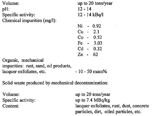 Wastes arising from decontamination of industrial equipment is the second group of 'Chernobyl waste'. These wastes are formed at Gomel enterprises during clean-up of equipment contaminated owing to intensive work of ventilation systems in the period after the Chernobyl accident. In 1991-1995, about 390 ventilation systems with contamination level up to 1500 beta-particles/cm2/min were treated and about 1300 units were found to require decontamination. The work results in annual generation of up to 20 tons of liquid and of about 10-20 tons of solid radioactive waste with the following characteristics: